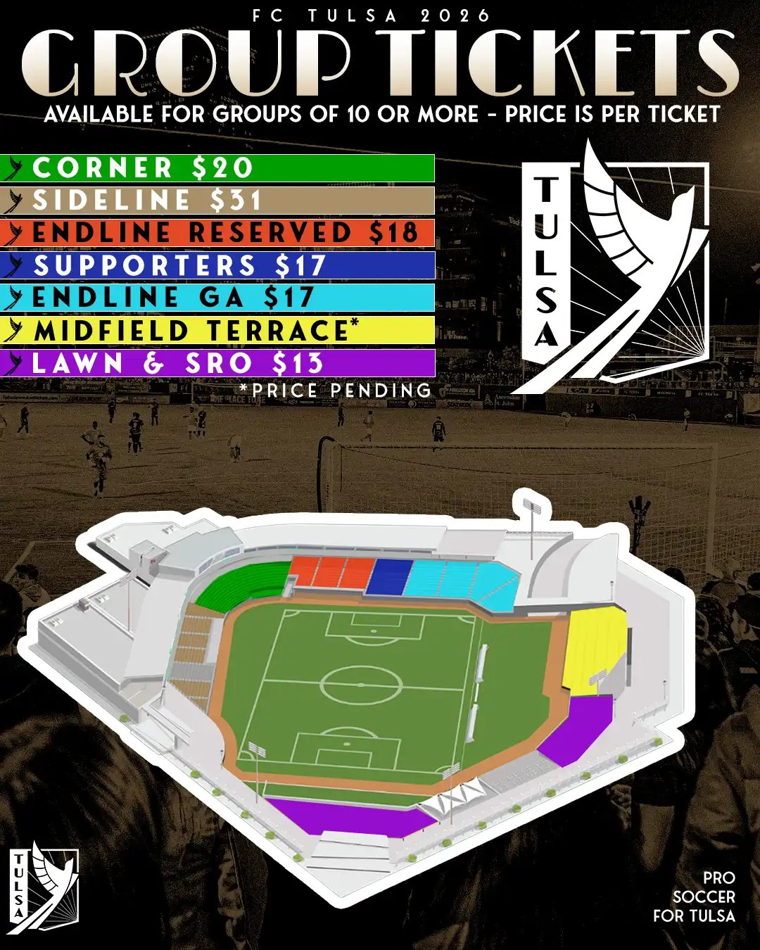 Groups can only be booked with an FC Tulsa ticket representative, so to learn more about pricing and booking your tickets please call 918-727-2231 or email tickets@fctulsa.com.